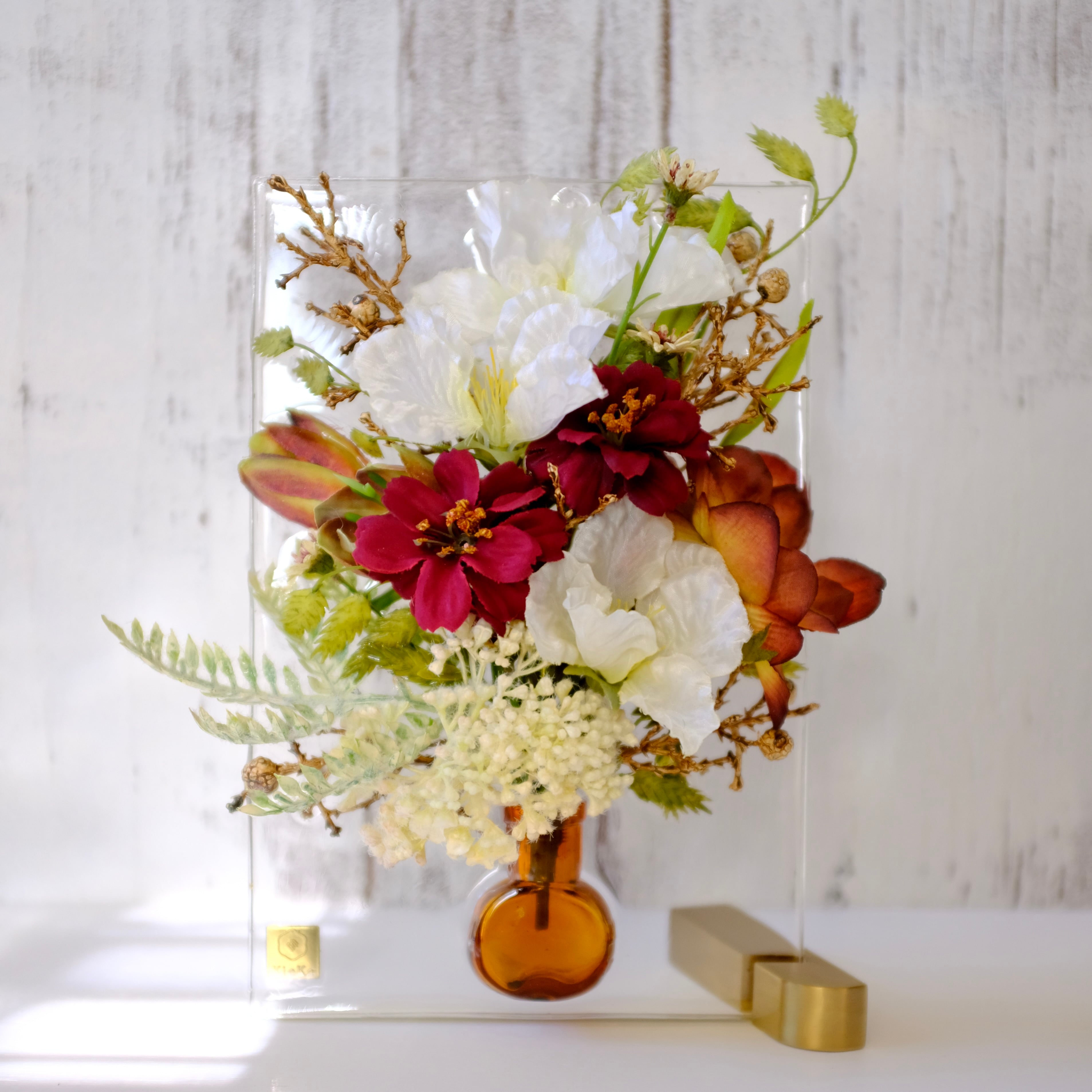 上部にたくさんの花材が入っているため木枠には合いませんので、真鍮の金具でお楽しみください。