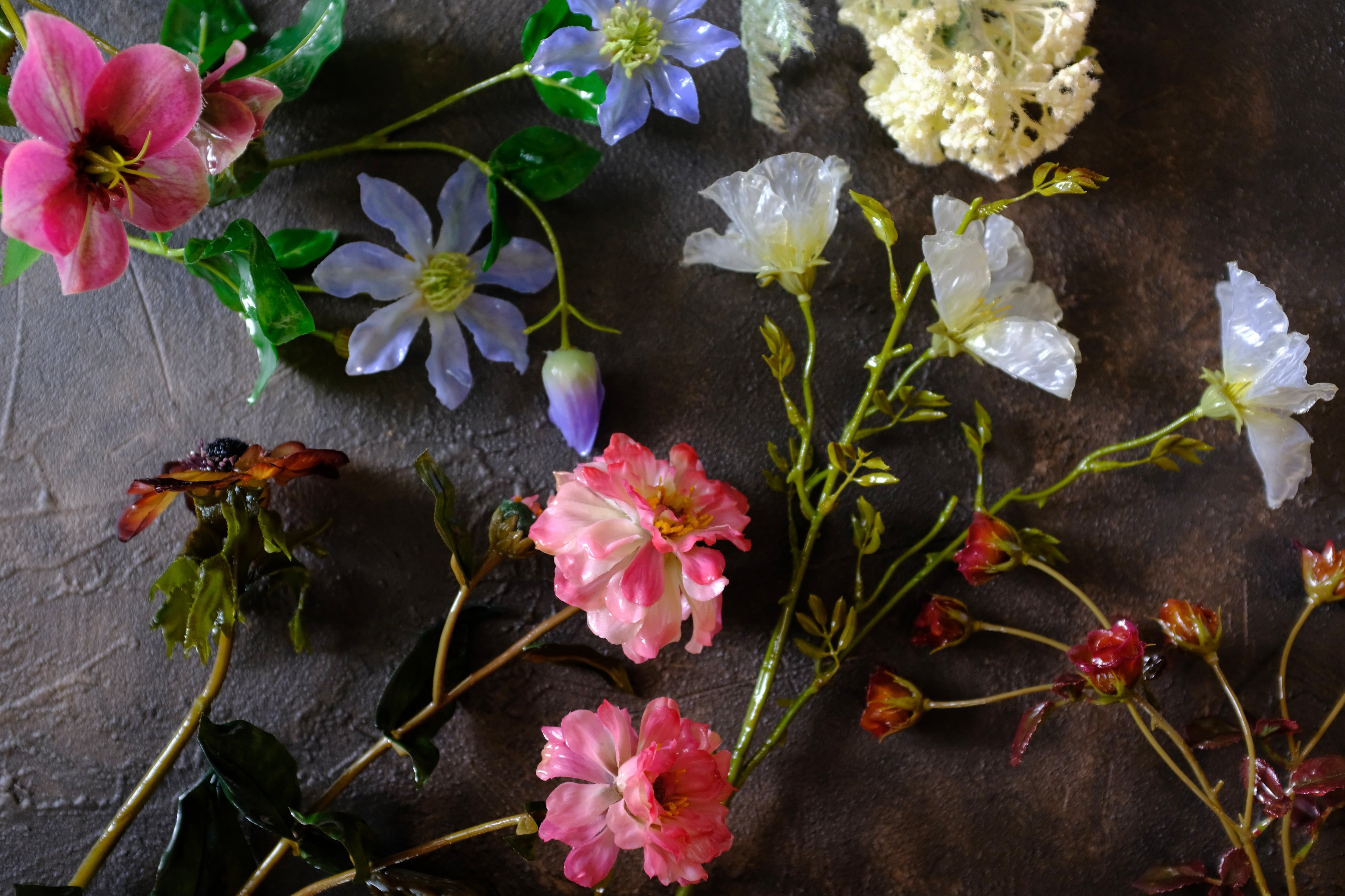 アーティフィシャルフラワーの花、葉、茎、すべてをコーティングして、どこから見ても艶やかな1本の花に仕上げました。