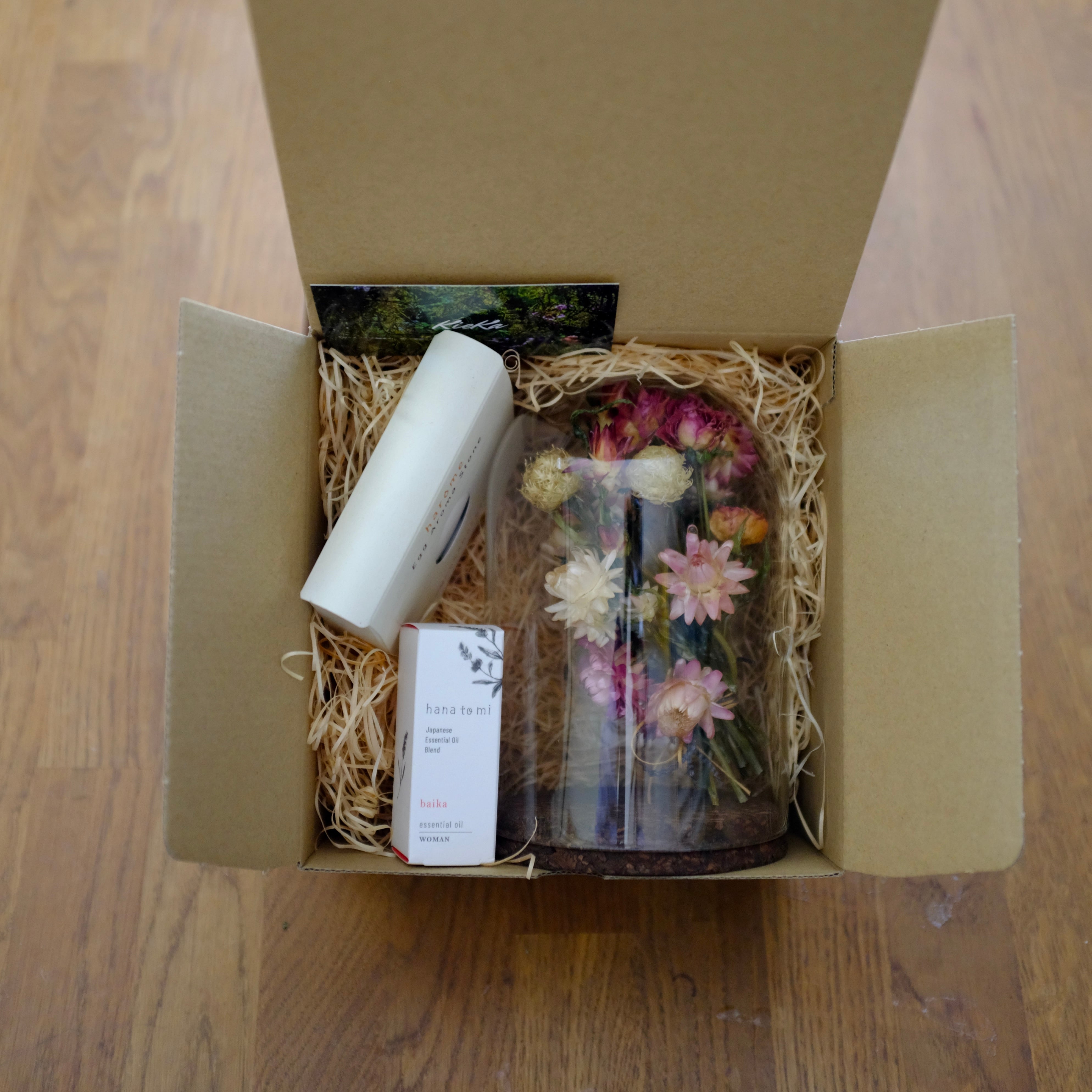 ドームフラワー、エッセンシャルオイル、アロマストーンの3点ギフトセットです。